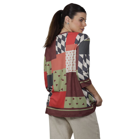 Blusa Decote "V" manga 3/4 BIXUGRILLO estampada Patchwork Quadrados