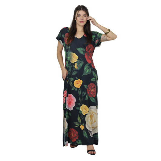Vestidos longo malha fria Bixugrillo estampado Rosas Bloom