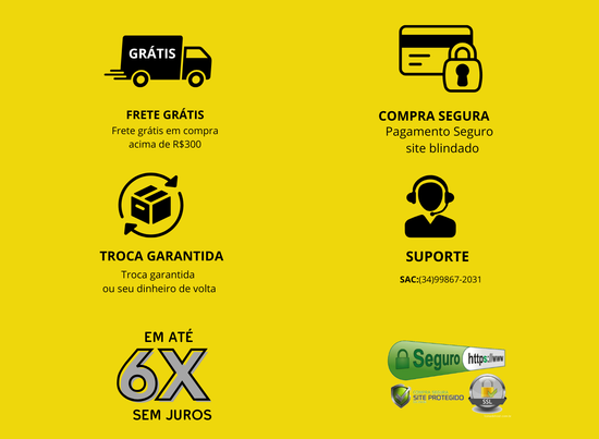 Troca de devolução são garantidas em compras de qualquer valor desde que o produto são seja devolvido sem violação. Consulte detalhes no rodapé da página.