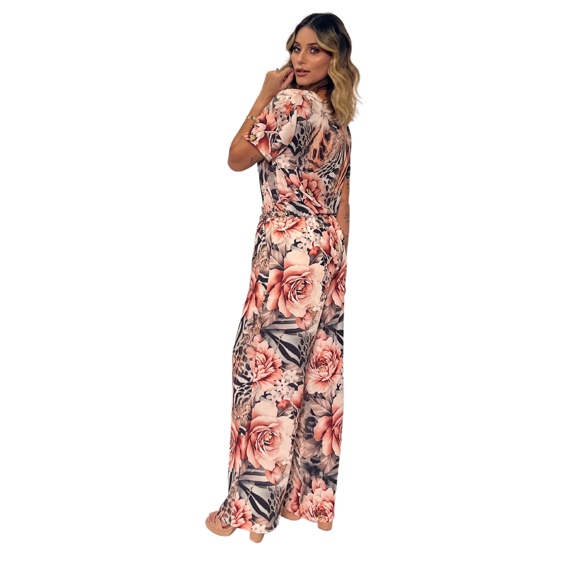 Conjunto Blusa decote "V" e calça pantalona Rosa Felina