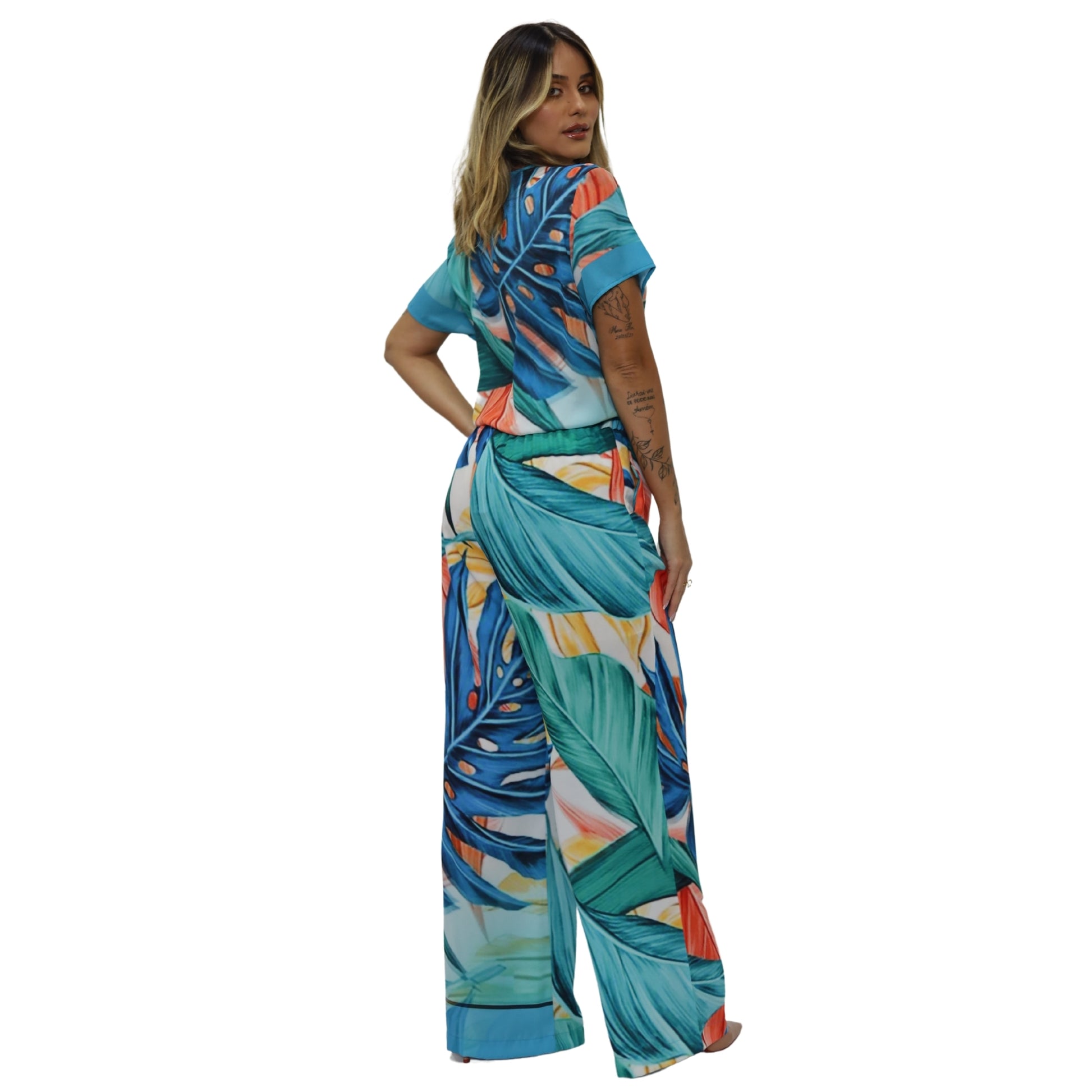 Blusa: Modelagem fluida com caimento impecável, trazendo leveza e sofisticação. A estampa exclusiva, criada pela nossa estilista, adiciona personalidade e autenticidade ao look.