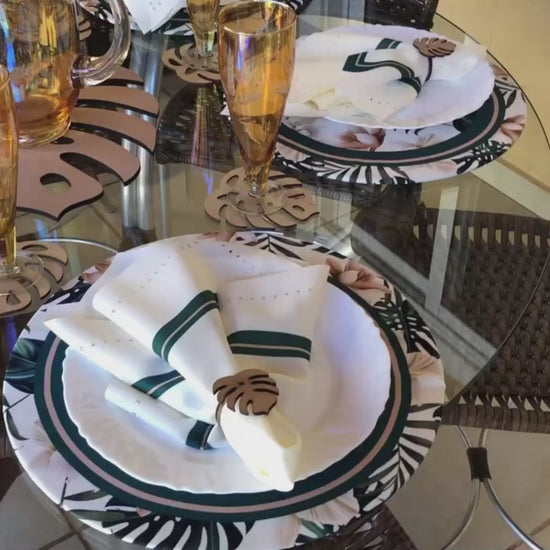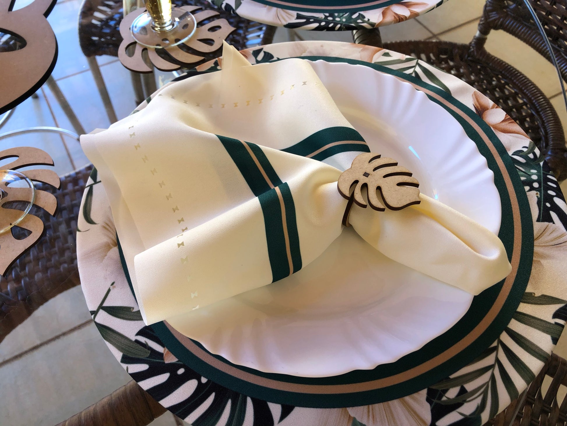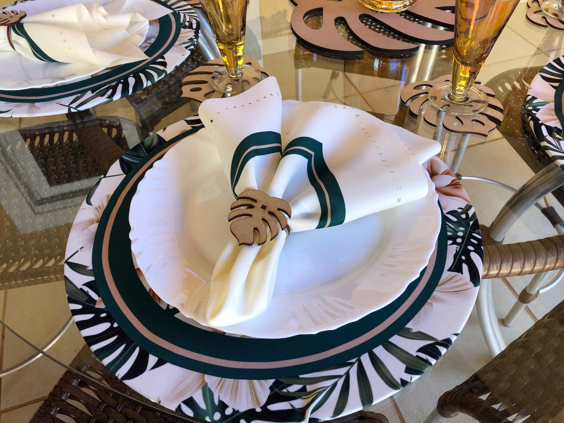Detalhes Cortados a Laser: Cada peça é única, com detalhes cortados a laser nos tecidos usados para capas de sousplat e guardanapos. Os acabamentos refinados elevam a experiência da mesa posta a um novo patamar.